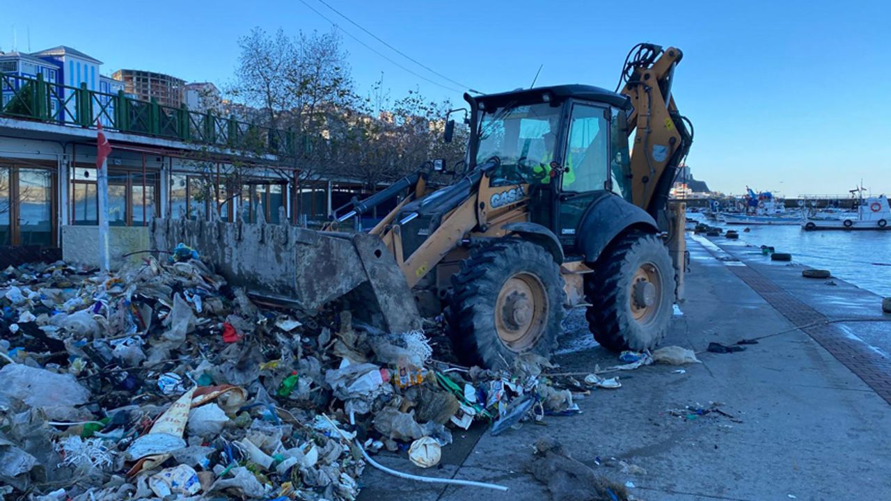 Şiddetli fırtına nedeniyle dalgaların sürükleyerek liman sahasına taşıdığı çeşitli atık ve çöpler Kozlu Belediyesi Temizlik İşleri Müdürlüğü ekipleri tarafından temizlenmeye başladı.
