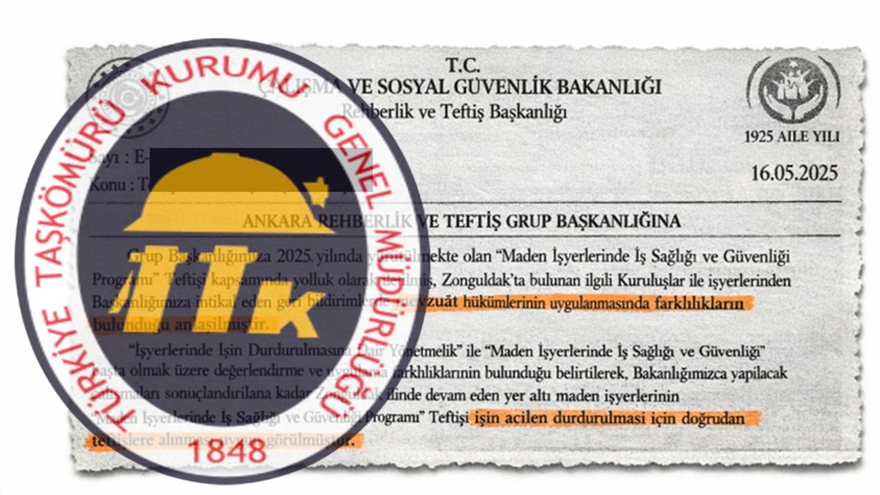 Çalışma ve Sosyal Güvenlik Bakanlığı Rehberlik ve Teftiş Başkanlığı'nın, Ankara Rehberli ve Teftiş Gurup Başkanlığı'na gönderdiği yazıda, Türkiye Taşkömürü Kurumu işletmelerinde eksiklikler olduğu belirtilmesine rağmen Mayıs 2025'te üretimi durdurmayarak, Ocak 2026'yı beklemesi kafa karışıklığına neden oldu.